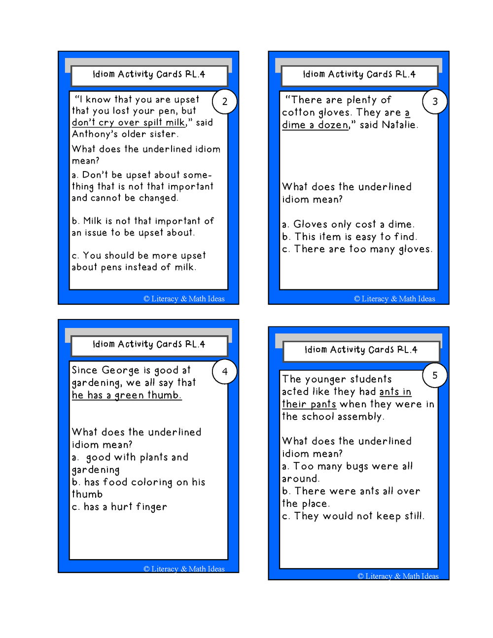 Looking for a fun and engaging way to teach your students about idioms? Look no further! Our Common Core Idiom Task Cards and Literacy Center is the perfect addition to your classroom. Aligned with Common Core State Standard RL.4, this document includes 25 idioms written in context, allowing your students to practice their understanding in a meaningful way.