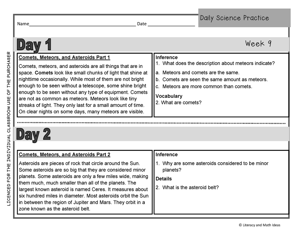 Our passages cover a range of science topics, from biology to physics and everything in between. Plus, our comprehension questions touch on essential skills like drawing conclusions, identifying main ideas, and summarizing information. With just a few minutes each day, your child can build a strong foundation in science and nonfiction reading.