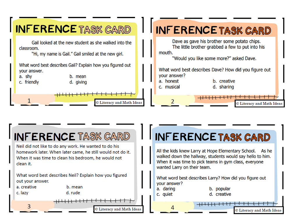 Aligned with Common Core Standards R.L.1. and R.I.1., as well as R.L.3., our Differentiated Inference Task Cards cover a range of topics, including character traits, setting, cause and effect, and word meanings.