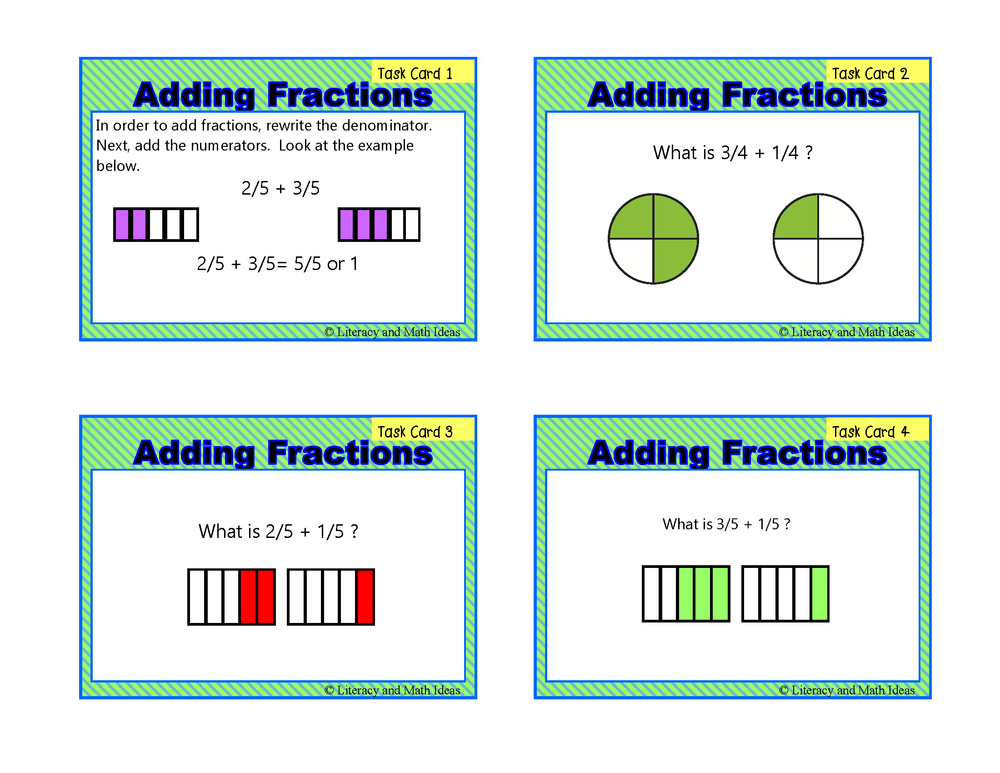 Looking for a fun and engaging way to teach your students how to add fractions with the same denominator? Look no further than our 250+ Fraction Task Card Mega Pack! Designed to meet Common Core standards, our task cards not only give students ample opportunities to practice adding fractions, but they also TEACH and REVIEW crucial strategies needed for success.