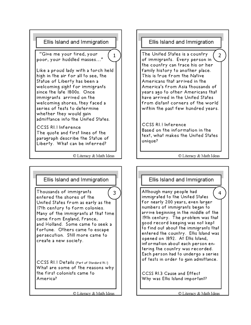 Looking for a fun way to reinforce Common Core inference, main idea, details, and summarizing skills while teaching about Ellis Island and immigration? Look no further than our printable box of activity cards! With 20 in-depth task cards, students will dive deep into what it was like to immigrate through Ellis Island and learn important social studies information at the same time. Our task cards are perfect for integrating Common Core Informational Text and social studies skills. Plus, with a printable box for convenient storage, our task cards can be used in a variety of ways, from Common Core literacy center stations, to small group review activities, and more! Don't forget to subscribe to our updates for additional resources, including our Infer About Colonial America product. With our task cards, education has never been more captivating.