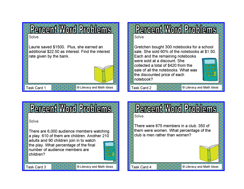 Are you looking for a way to improve your students' understanding of percents? Look no further! These Percent Word Problems Task Cards are the perfect solution. With 32 task cards and a variety of real-world math problems, your students will gain valuable skills in no time.