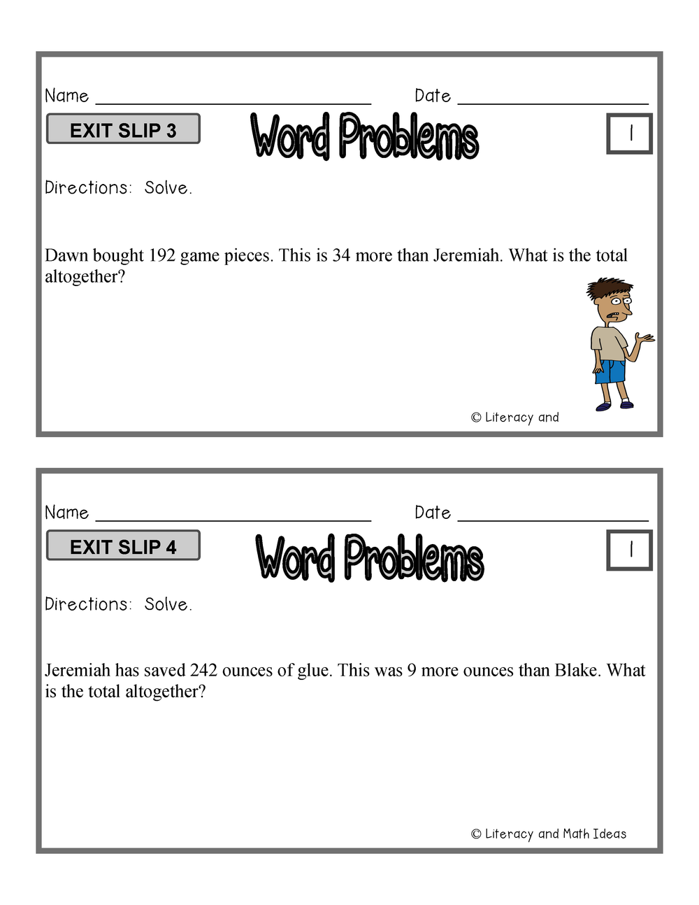 Use these exit slips as a quick and easy way to monitor student progress at the beginning or end of class, or use them to determine student groupings for math centers. With one-step and two-step problems included, these exit slips are ideal for math intervention or as a differentiated math center activity. They even make an excellent resource for test review or test prep!